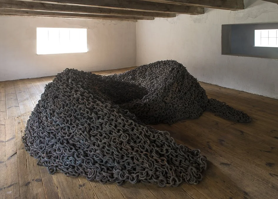 How cold was it when you first saw L’image de l’image (1988)? I rubbed my numb hands together. Relentless cold had spread through my body having first slowly penetrated my snow-soaked boots and freezing feet. We had walked across the mist-chilled, snow-covered expanses from the manor house to the old granary, where the floorboards creaked with every step we took. But the temperature did not impinge on what we saw there: a strange sculpture, almost like a creature cowering on the floor. Or rather: two forms curving toward each other, made from dark, heaped up chains. Their interiority unleashed a tender wave of warm empathy for what looked like two stranded seals on their bellies, curled into each other like a matching pair. Or like two identical migrating dunes, whose ridges form two interlocking, mirror-image C-curves as if in a scarcely credible landscape. Clearly no wind could have come from two directions at once to produce this strange formation. Each curve is supported by paddle-like extensions that serve to somehow bring the elegantly mobile material to a halt. The question of their weight immediately crops up. How heavy are these chains? How heavy is their image? Are these images of chains or endlessly mirroring images of ideas? It was impossible to decide which was the original picture. An image of an image of an image, tautologically turning back in on itself, with no opening, no explanation.