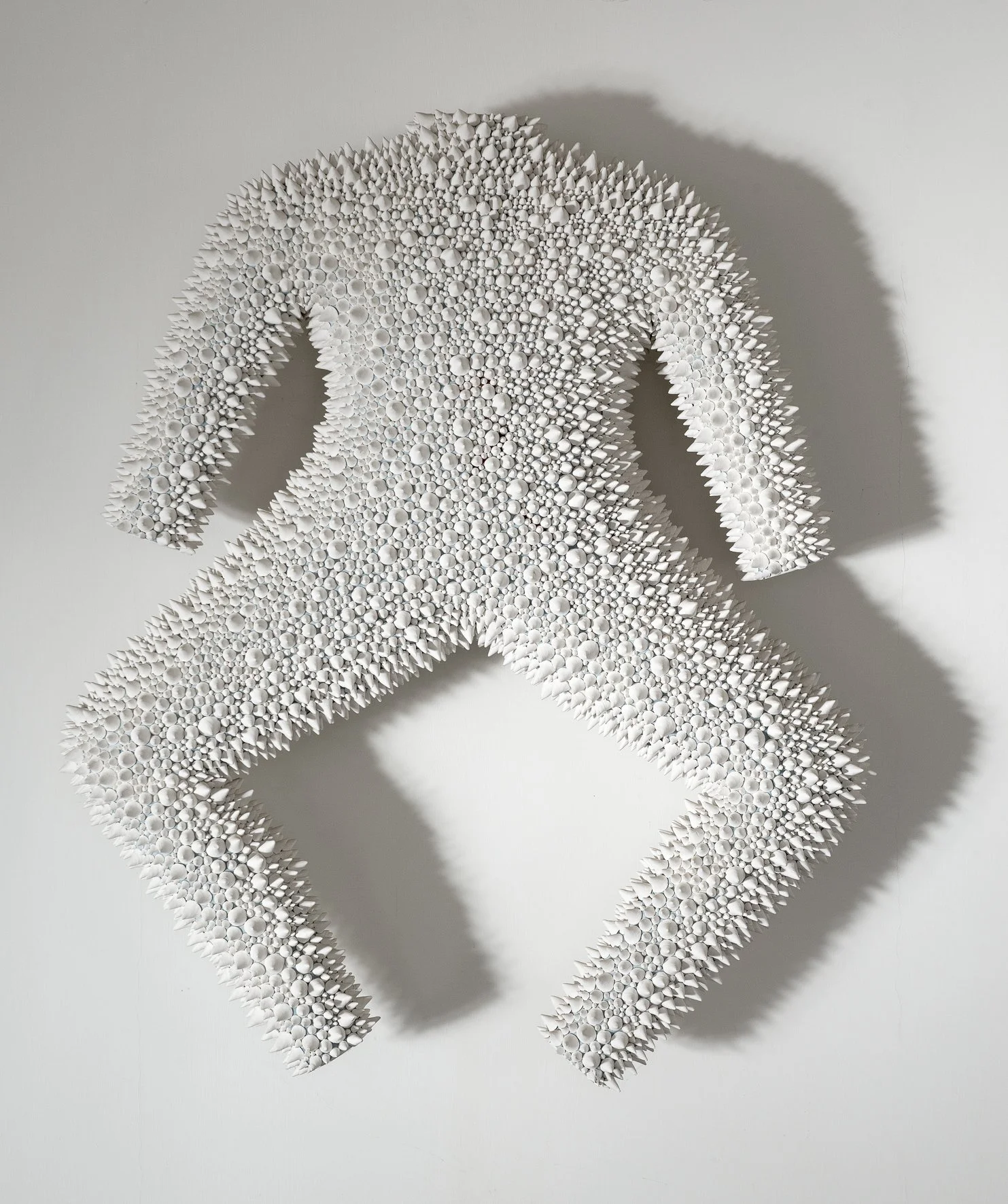 In Father (1986), a white marble floor piece that might easily be overlooked, we are unable to discover any rules relating to a comparably evolutionary reference system. This little sculpture consists of a thick curve of marble forming an incomplete letter “U.” There is something sketch-like about it. It is bent like a fat hook, slightly clumsy, not leading anywhere, not holding anything. It calls to mind stylized body parts that waver between mobile corporeality (arm) and static volumes (torso). However, its most striking feature is the treatment of the surface. It is both threatening and hostile, densely covered with pointed little teeth that sprout out from the strange body part like crystals in varying sizes. It must have been devilishly difficult to carve all these little spikes out of the marble block. This is completely at odds with the idea of a bozzetto, which generally involves using an easily-worked, soft substance to try out an idea that will eventually be executed in a more unyielding material. This seemingly unassuming piece shows just how much effort must have gone into making it. Traces of chiseling and rasping have neither been filed down nor polished — it looks almost like a small, hard chunk of wood that a restless child has been working away at with a whittling knife. As to its meaning, this work is puzzling and inscrutable, but, as a nucleus for later works, it clearly has a role connecting personal and collective history.